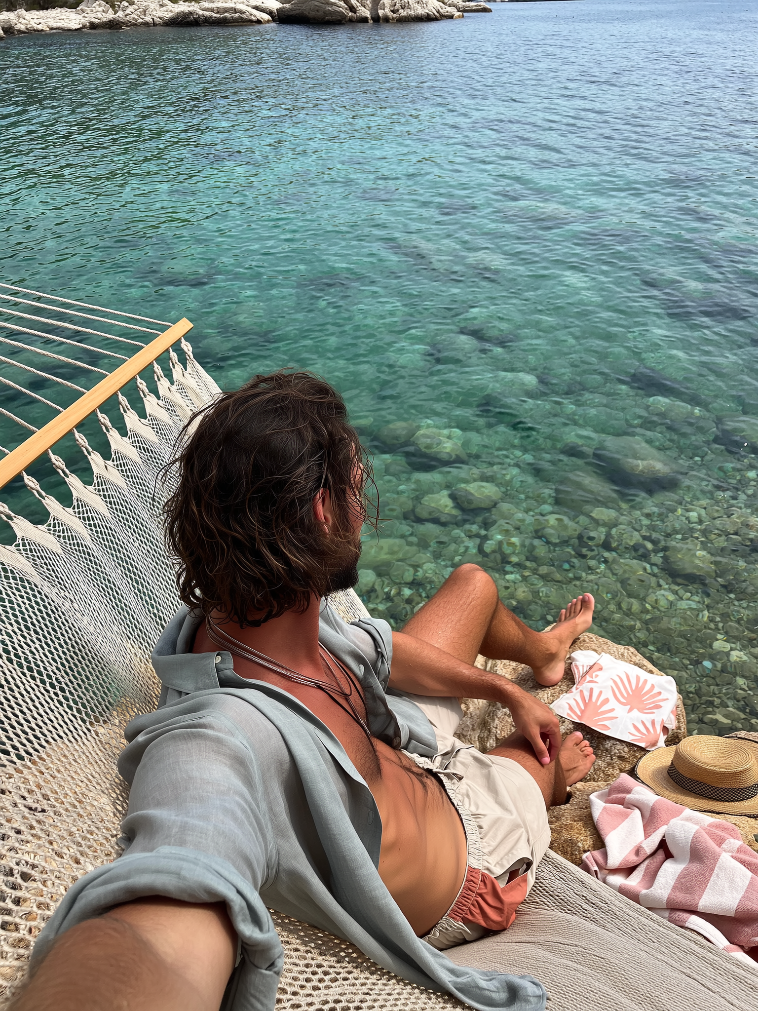 Wide shot approximately 10 meters away capturing a slim man with long tousled hair reclining leisurely on a woven hammock stretched between two olive trees at the edge of a crystal-clear Mediterranean inlet. He wears lightweight beige swim shorts featuring subtle terracotta and dusty rose color-block panels along the sides, paired with an open, breathable linen shirt in soft muted sage, sleeves rolled casually to elbows. Around his neck, layered minimalist necklaces in polished silver and matte leather evoke effortless bohemian elegance. His bronzed skin glistens with a faint sheen from the gentle midday sun, natural skin textures warmly highlighted. Below the hammock, the tranquil turquoise water laps gently over sun-bleached smooth stones visible beneath the waterline. A woven straw fedora hat and a canvas tote with salmon pink abstract botanical motifs rest quietly on the nearby sun-warmed rocks, alongside a soft crinkle fabric striped towel in blush and ivory. The candid composition favors a three-quarter over-the-shoulder view from slightly above, typical of an iPhone snapshot, conveying tactile Mediterranean leisure with water visually dominant in the foreground and background, emanating serene and exclusive ambiance. —hyper-real texture fidelity, natural skin