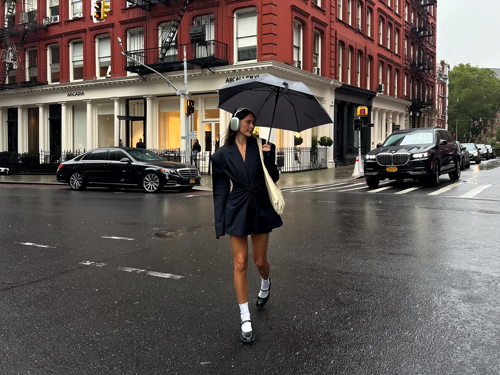 She crosses a slick city street under a soft drizzle, right hand gripping a dark grey umbrella while large white headphones cocoon her ears; an oversized black blazer cinched like a dress drapes over bare legs, paired with crisp white ankle socks and chunky black Mary Jane heels, a beige canvas tote swinging gently from one shoulder. Behind her, a deep red brick building with sharp white window trims and black iron fire escapes anchors the scene, storefront signs 'ARCADIA' and 'LKGALLERY' subtly visible above two parked black luxury sedans. The muted overcast light diffuses evenly, softening shadows across the wet asphalt that gleams with mirrored reflections of the quiet street. Tiny raindrops bead the umbrella fabric, slight motion blur brushes her mid-stride pose; the frame is portrait-orientated, eye-level and slightly off-center, lens catching the subdued city palette with natural iPhone sensor grain and the occasional raindrop distortion along the edges —rainy city snap, shot on iPhone
