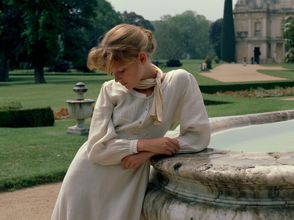 In a serene, sun-dappled garden of a vast estate, a young teenager dressed in a delicate ivory linen dress with subtle embroidery leans thoughtfully against the weathered surface of an ancient marble fountain. Her soft, caramel-toned hair is gently tousled in an effortless style, and a light silk scarf drapes loosely around her neck, catching the afternoon light with a whisper of sheen. The subdued pastel palette of creamyBeige and soft greys blends harmoniously with the lush greenery, evoking an air of contemplative innocence and quiet grace. Under the calm lens of a 50mm prime, the scene is imbued with the tactile texture of linen, smooth marble, and the gentle analog imperfections of 35mm film, reminiscent of classic Slim Aarons’ portraits that celebrate elegant youth and natural poise.