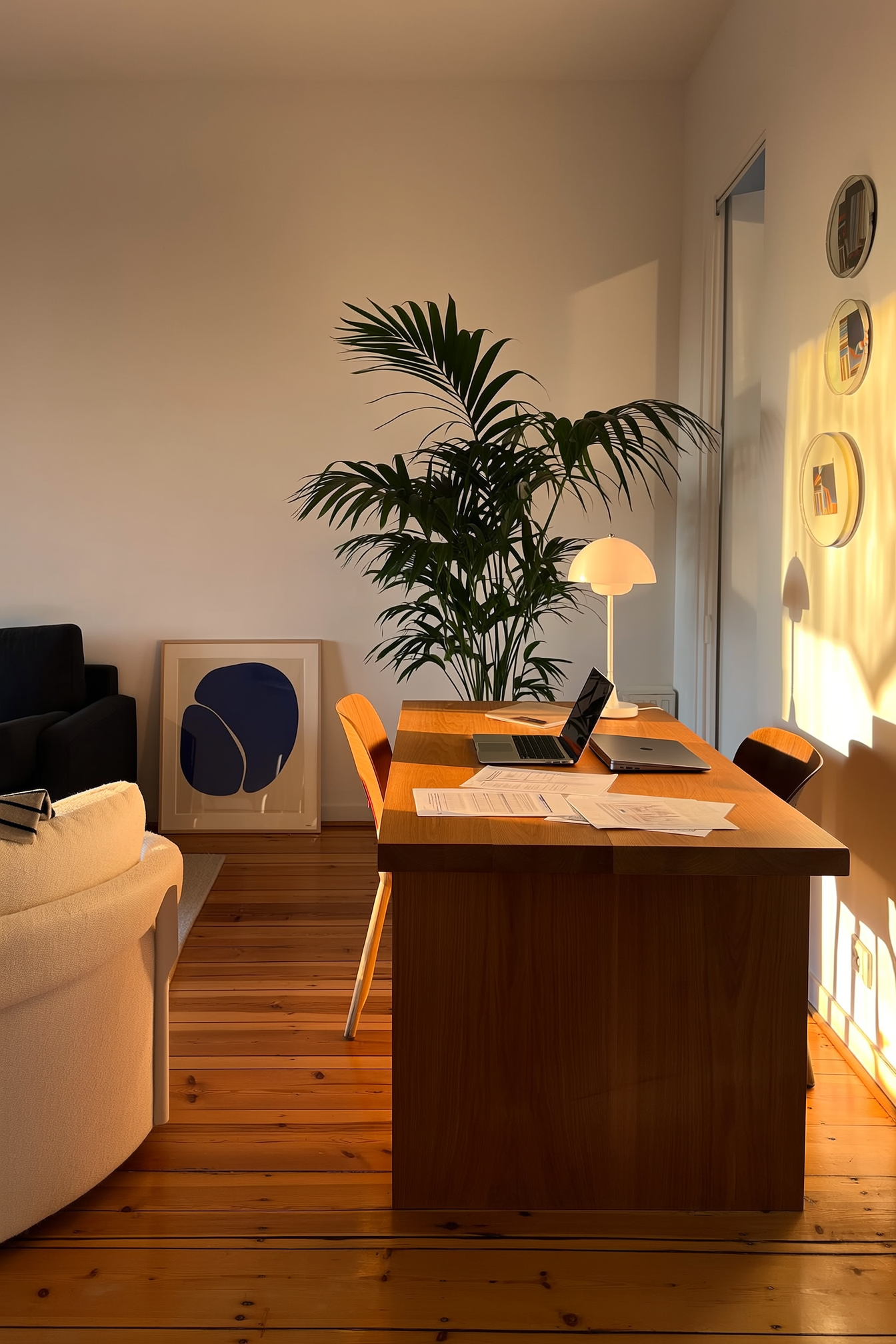 Bathed in the soft glow of golden hour sunlight, a Scandinavian home office exudes quiet warmth and refined simplicity. The wooden desk, its grain rich and tactile, supports two open laptops amidst scattered papers that catch glimmers of amber light. A sleek white desk lamp contrasts gently with the clean white wall behind, while a tall, vibrant green palm plant fills the corner with lush vitality, its leaves filtering subtle light. To the left, a cushioned cream armchair faces the desk invitingly, textured fabric catching gentle shadows. A glimpse of a black sofa edges into the frame, lending depth to the composition. Nearby, framed abstract artwork in cool blue tones leans casually against the wall, offering a serene counterpoint to the warm palette. Sunlight streams from the right, casting sharp, elongated shadows that dance across the polished wooden floorboards, enhancing the scene’s tactile contrast. The mid-frame composition centers on the desk, the iPhone’s lens capturing a balanced, intimate glimpse into this tranquil workspace, with natural hues and textures harmonizing under the fading daylight.