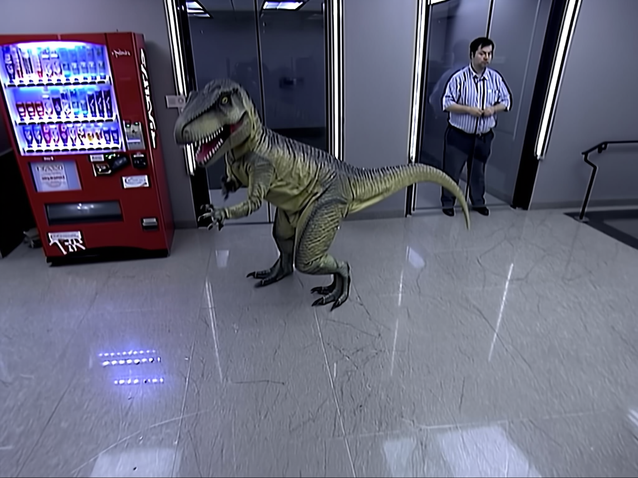 A grainy, blurred top-down CCTV-style shot of a man wearing a full-body dinosaur costume, mid-motion angrily kicking a soda vending machine twice in an office building lobby. He has just removed the dinosaur head mask, holding it in one hand before slamming it to the ground. The polished tiled floor beneath his feet shows faint scuffs and reflections from harsh, flat overhead fluorescent lighting that evenly illuminates the scene with minimal shadowing. Visible nearby, a janitor stands silently behind a glass door, his casual work clothes and neutral expression caught through subtle glare and smudges on the glass. The entire scene is captured in muted, desaturated colors with pronounced grain, compression artifacts, and moderate blur typical of surveillance footage. The framing is a wide, slightly off-center top-down angle, including the man, vending machine, floor details, and janitor to emphasize the authentic observational style of CCTV video in a public indoor environment.
