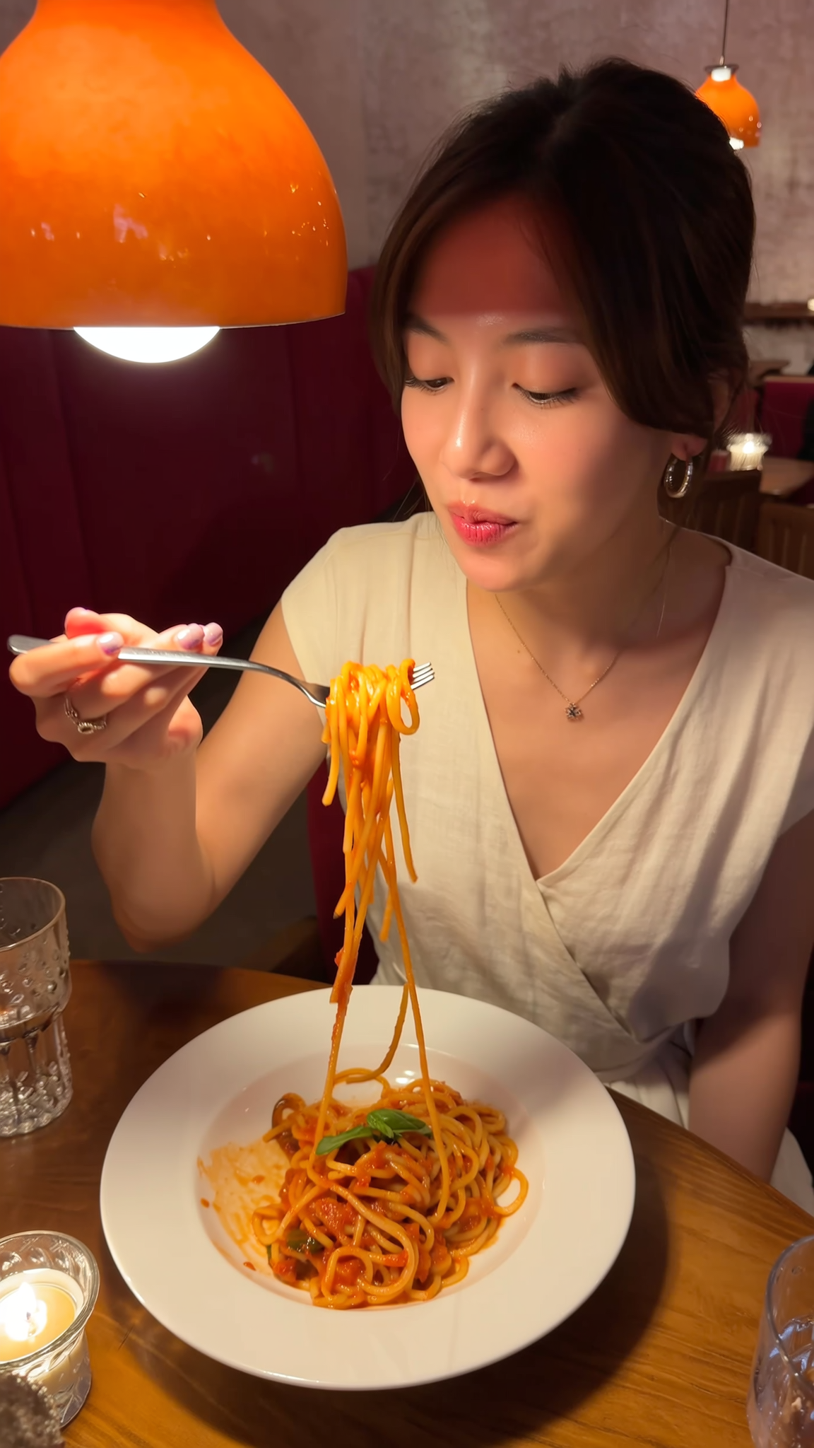 She lifts a delicate forkful of spaghetti, the strands glistening with a rich, velvety tomato sauce that clings with slight sheen and hints of fresh basil. As she begins to slurp the noodles, the texture of the pasta pulls taut, a subtle drip of sauce capturing the quiet intimacy of the moment. Her expression remains composed—eyes half-lidded, lips just parted around the glistening strands, embodying tranquil absorption in the quiet feast.