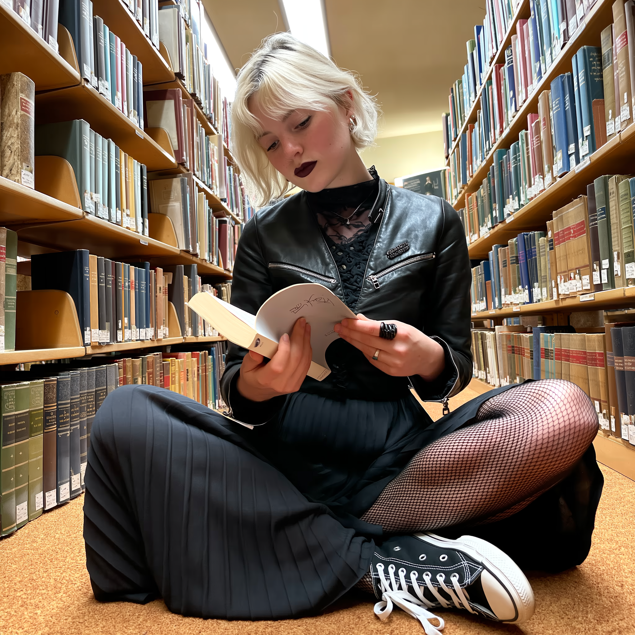 A young woman with short bleached hair styled in a slightly tousled manner, wearing dark, matte lipstick, sits cross-legged between tall, densely packed wooden bookshelves in a dimly lit library. She’s dressed in an all-black outfit that includes a flowing, long pleated skirt over subtle fishnet tights, paired with classic black and white Converse Chuck Taylor All Star sneakers. Her black top features layered textures—a slightly sheer blouse under a cropped leather jacket with silver zipper details and minimalistic black rings on her fingers. The young woman flips through a well-loved poetry book with a gently worn matte cover, her skin showing natural texture and subtle warmth under the soft, ambient fluorescent library lighting. The shelves around her display rows of hardback and paperback books with richly textured, muted covers and spines. The camera angle is a close, low perspective framed from between the shelves, slightly off-center with a level, natural horizon, capturing her focused expression, minimally aware of the camera, conveying a spontaneous and authentic moment. The overall atmosphere channels the library-core, indie, Y2K, and tumblr aesthetic with layered clothing textures, tactile surfaces, and warm artificial indoor lighting, captured with the dynamic, imperfect realism characteristic of an iPhone snapshot —high-fashion editorial, hyper-real texture fidelity