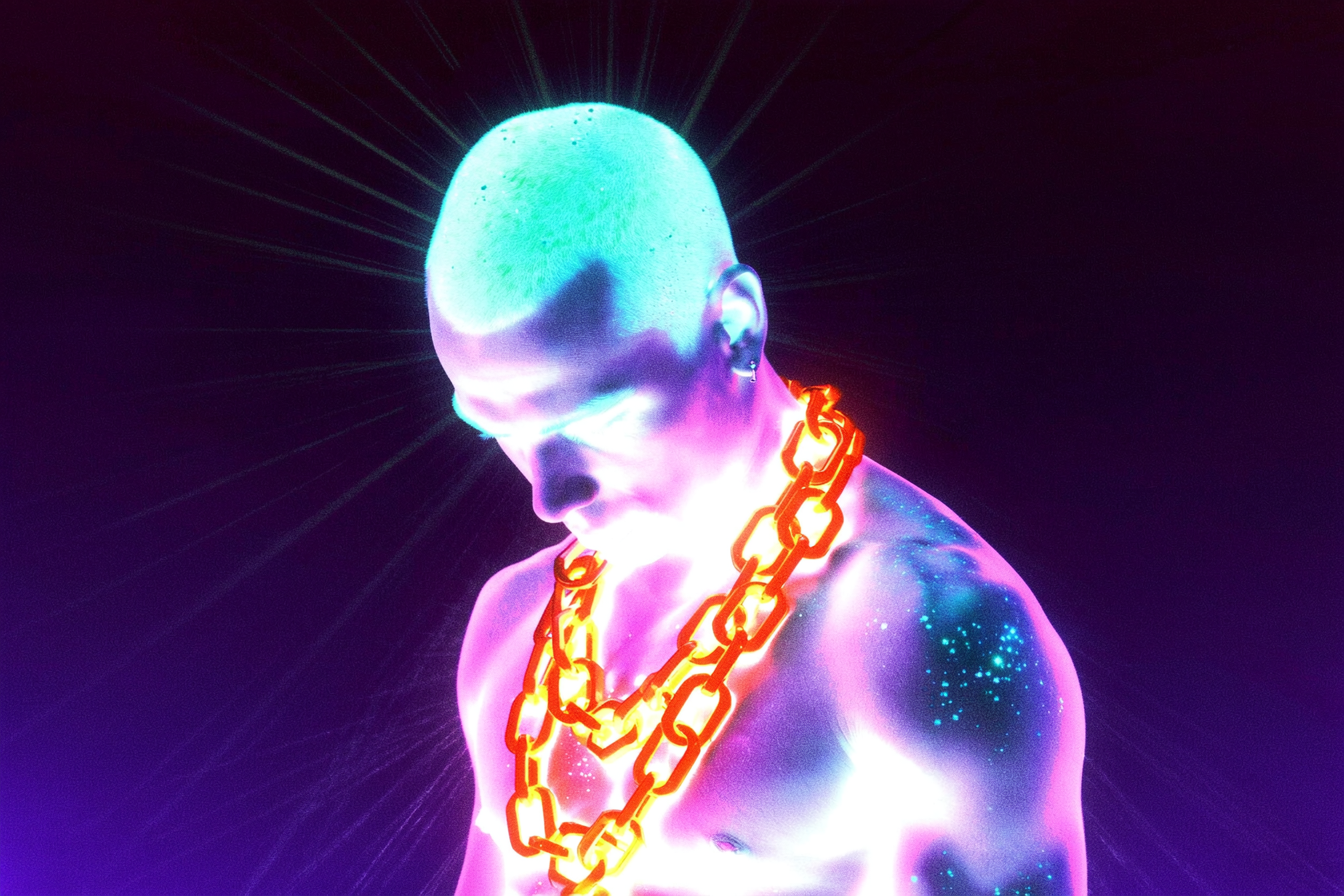 A luminous male form bows forward, neck taut, veins aglow with electric teal flashes against a deep violet void that amplifies his spectral stillness. Heavy chains, molten and iridescent, drip like liquefied titanium from his collarbone, their radiant orange glint inverted into plasma white by an infrared channel flip, creating an eerie fusion of weight and lightness. His skin seems to dissolve into ghostly silk streams, bleeding pastel pinks and blues that scatter under coarse grain clusters and sporadic dust specks, like memories seeping through aged film stock. The photo quality suggests a slightly grainy or low-resolution digital look, capturing a candid moment where faint gate-weave jitter shivers along the edges. Subtle radial blur streaks pulse softly around the bowed crown, as if caught mid-motion in a hypnotic dance of flux and gravity. Captured with a Canon EOS R5 through an RF 85mm ƒ/1.2 lens, overlaid with scanned 800 ISO tungsten film grain and sprocket-flash burn, this vision radiates unease and ethereal grace.—surreal inverted-color fashion editorial, heavy film grain texture