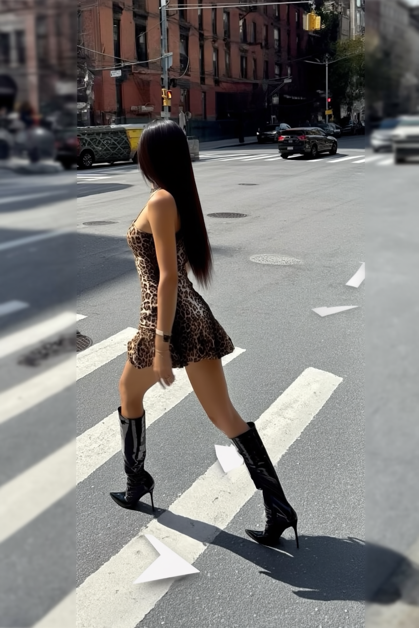 A girl walks across an empty urban intersection wearing a leopard print mini dress and tall patent leather boots. Her long straight hair flows behind her, and she looks slightly to the side as if caught mid-step. The white arrows and Google Street View overlay float at her feet. Harsh sunlight and slight motion blur give it the perfect “found footage” feeling.