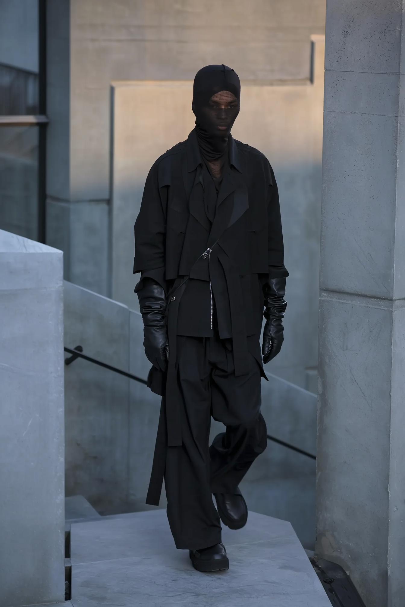 A softly dim-lit iPhone snapshot capturing a model walking slowly in an avant-garde Boris Bidjan Saberi ensemble composed of layered, predominantly black garments including a loose-fitting jacket, oversized pants, black leather gloves, and a semi-sheer head covering subtly obscuring the face. The model's expression is neutral, with minimalist hair and ultra-wide cheekbones hinted through the delicate sheer fabric. Set within a quiet Brutalist environment of gently weathered concrete walls in muted greys and steels-blues, angular geometric forms frame the background without direct sunlight. The softly diffused twilight casts subtle shadows and muted highlights, emphasizing matte textile folds and the quiet texture of the concrete surfaces. The composition is slightly elevated and tilted downwards, positioning the model casually off-center amid generous negative space, softly framed by textured concrete edges. The overall palette is calm and cool, replacing any crimson hues with shadowy black and dusky blues to maintain an effortlessly moody, intimate dusk ambiance.