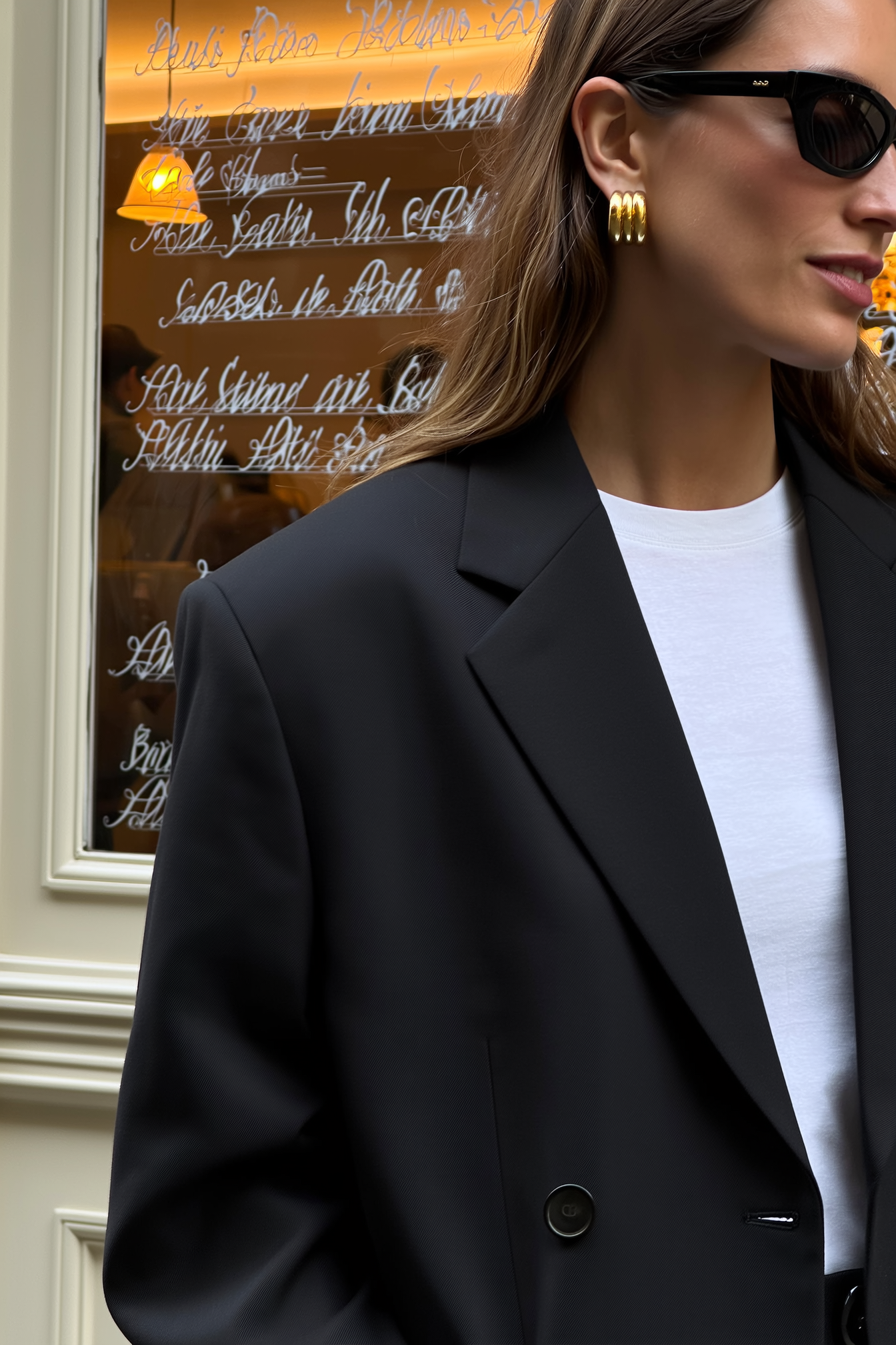 Soft diffused light bathes a close-up of a woman’s upper body, clad in a black oversized blazer layered over a pristine white tee. Chunky gold hoops catch glimmers of ambient glow, while dark sunglasses lend an air of mystery. Behind her, the delicate scribbles of a Paris wine bar menu trace across glass, infusing the scene with continental charm. The tactile weave of the blazer’s fabric contrasts subtly with the smooth sheen of the gold accessories and the matte finish of the tee. Framed tightly, the composition captures the interplay of textures and subdued tones, evoking an effortlessly stylish city moment shot on an iPhone with natural softness and clarity.