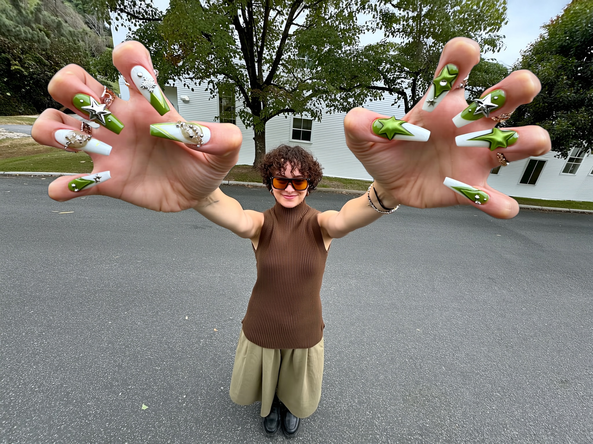 A person standing outdoors on an asphalt road with trees and a white building in the background. They are wearing a brown sleeveless ribbed knit top, beige wide-legged pants, and black shoes. Their hair is curly, and they wear large amber-tinted sunglasses. The person extends both hands towards the camera, showing long, artistic acrylic nails decorated with a green and white color scheme, featuring star shapes, 3D elements, and studded accents. The image has bright natural lighting and is captured with a wide-angle lens from a high-angle perspective, creating a strong sense of depth and focus on the detailed nails. The overall photo is sharp, vibrant, and has a contemporary digital quality with slight distortion due to the close-up of the hands.