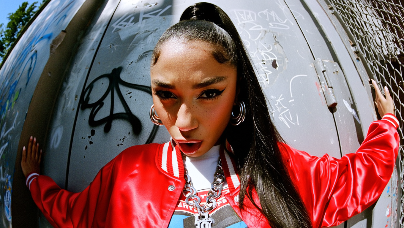 She stands against a cracked urban wall with graffiti tags and peeling paint, sunlight casting sharp shadows across her cheekbones and jacket folds, while reflecting off her jewelry’s polished surfaces. The wide-angle lens curves the background toward her, compressing space and emphasizing her dominance in the frame. A subtle grain effect overlays the image, preserving the skin texture, fabric sheen, and environmental grit with editorial clarity. early-2000s Y2K snapshot