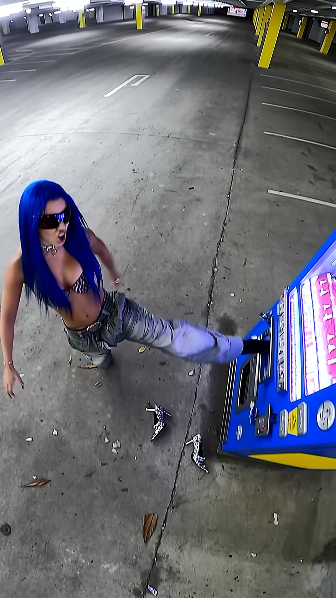 A grainy, blurred top-down CCTV-style shot of a woman resembling Kim Kardashian with striking neon blue hair styled straight, wearing oversized dark sunglasses, and a fashionable outfit reflecting casual yet bold style. She stands in a deserted underground parking lot, characterized simply as "in parking," with a rough concrete floor beneath her feet featuring faint tire marks, small scattered debris, and subtle oil stains, all illuminated by harsh, flat, even overhead lighting typical of fluorescent or floodlights. The woman is mid-motion aggressively kicking a vending machine, her posture tense and dynamic, with a broken stiletto heel snapped in half lying on the ground near her foot. Her expression is captured as a distinct snarl while glancing upward, unaware of the camera’s gaze. The image showcases authentic grain, pixelation, compression artifacts, and moderate blur consistent with CCTV video quality, with muted and desaturated neutral tones dominating the color palette. The wide, slightly off-center framing captures the full upper body and surroundings, emphasizing the utilitarian, observational style of surveillance footage in a stark, empty parking environment.