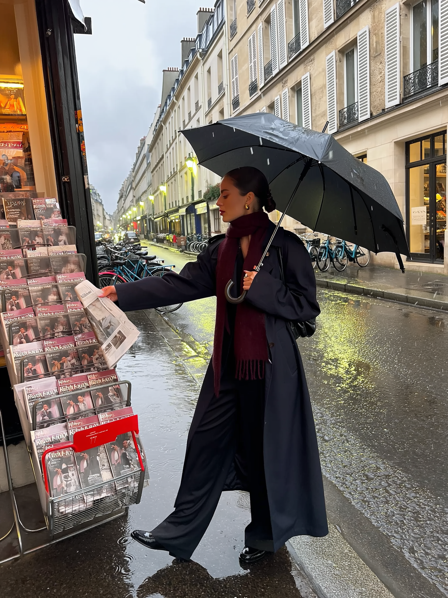 Under the soft drizzle by a corner newsstand on a quiet Parisian street, she stands poised in a dark oversized trench coat with shoulders lightly raised, black straight-leg trousers flowing with polished loafers just skimming wet pavement. A burgundy scarf drapes loosely around her neck, tucked slightly inside her coat, gold earrings flashing as her slick low bun catches scattered neon shards. Holding a slick black umbrella angled back, droplets bead its surface while her outstretched hand reaches for a folded newspaper amid fluttering wet magazines stirred by the misty breeze. Textured stone walls and shuttered windows rise behind rows of parked bicycles, their forms softened in reflected neon hues shimmering across the damp sidewalk. The overcast sky mutes daylight, sodium streetlamps casting halos that ripple across puddles. The handheld iPhone frame tilts gently mid-distance, catching an intimate, cinematic profile in candid pause — rain tracing fabric textures, umbrella ribs, and the subtle sheen on her face. —rainy city snap, shot on iPhone