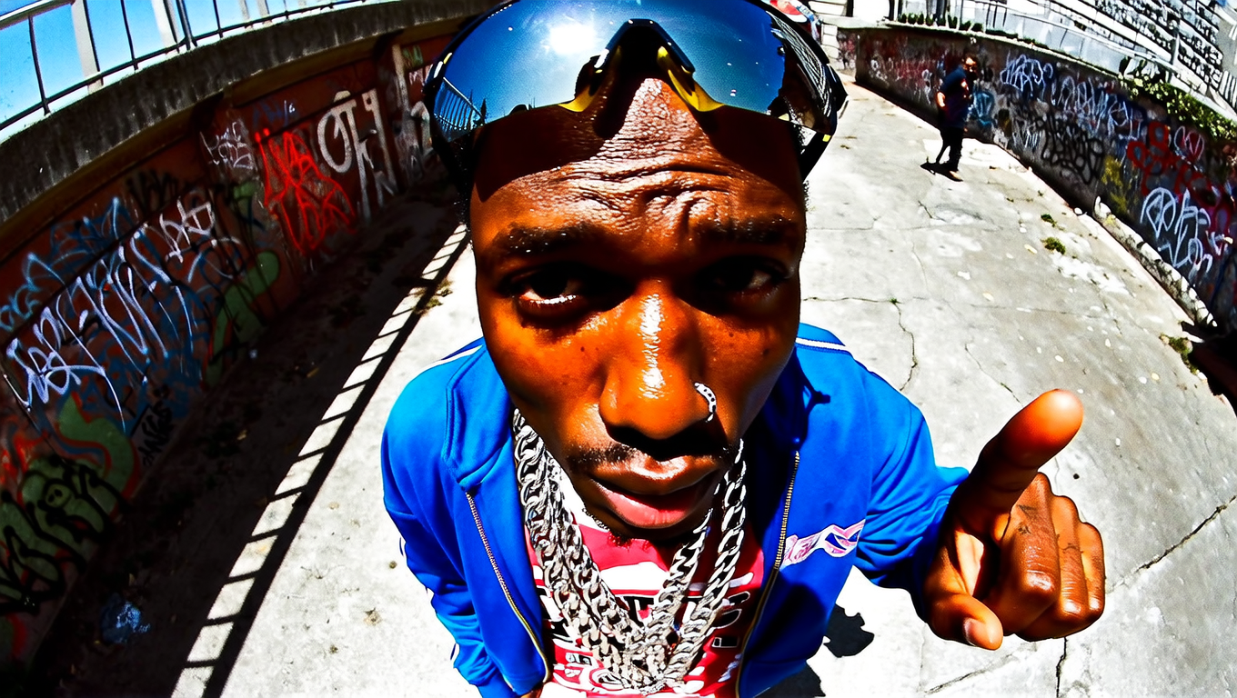 A wide shot of a Black man with warm brown skin and coarse natural skin texture visible across his forehead, nose, and cheeks, captured in a middle close-up from a top-down wide-angle perspective. He wears a bright cobalt track jacket zipped halfway over a bold graphic tee, heavy silver Cuban link chains draped prominently around his neck and large reflective sunglasses pushed up on his forehead. His face is close to the lens and slightly off-center, the fisheye distortion enlarging his nose, lips, and extended hand pointing assertively toward the camera.