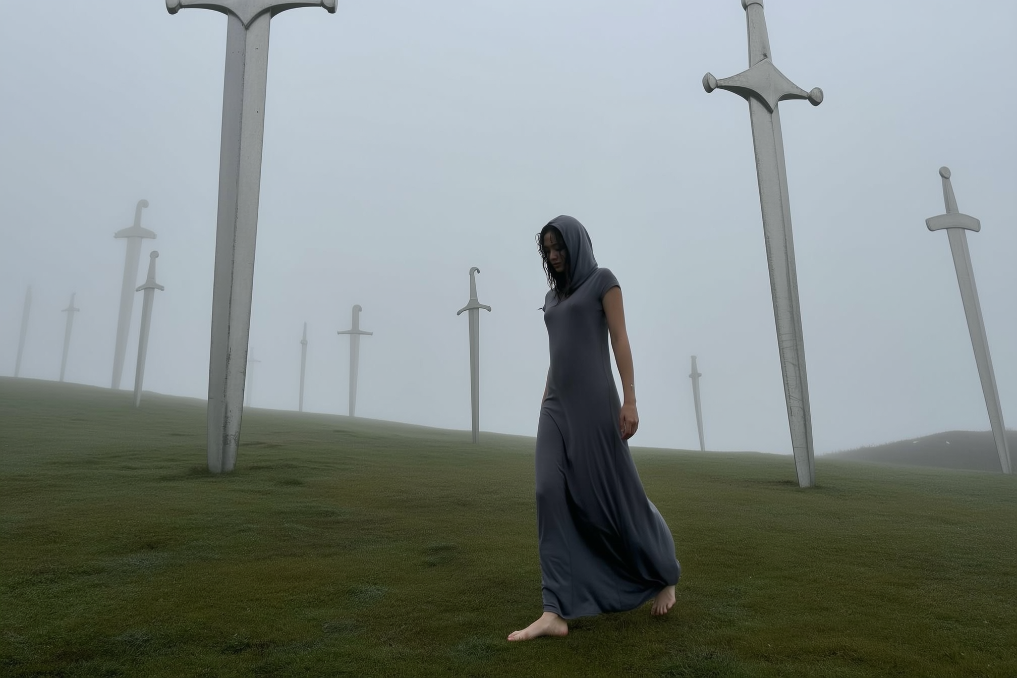 A spontaneously captured iPhone photo of a barefoot woman walking through a misty, softly sloping field dotted with monumental, vertically embedded metallic swords. She wears a long, flowing dark-grey dress that drags lightly behind her, with a loose hood obscuring part of her damp, naturally tousled hair. Her serene, introspective expression reveals subtle natural skin textures under the diffused, fog-filtered daylight. The muted color palette features soft greys and muted greens mingling with the cold shimmer of worn steel on the gigantic swords, their surfaces gently reflecting the mist. The composition feels casually framed with an off-center, slightly upward angle that emphasizes the surreal scale contrast between her slender figure and the towering swords, capturing authentic atmospheric moisture on the fabric and grass around her, evoking quiet melancholy and enigmatic solitude.