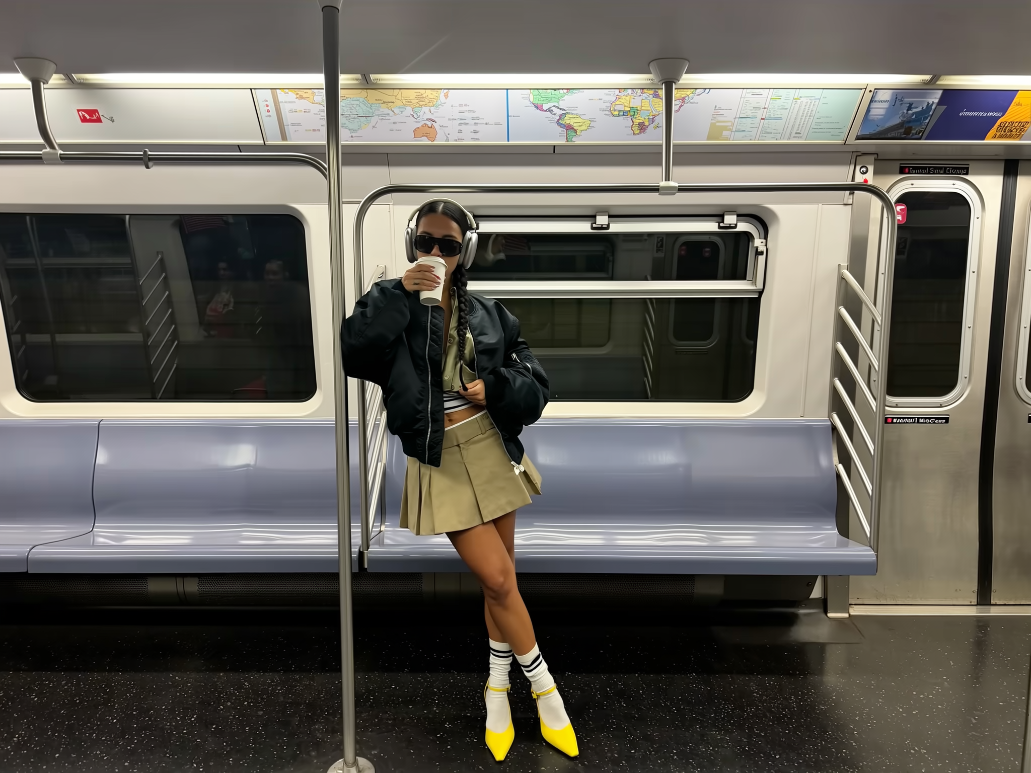 A stylish young woman stands inside a subway car, leaning casually against a vertical handrail positioned just left of center. She wears oversized headphones and dark sunglasses, her cropped bomber jacket slightly open over a beige pleated skirt that falls to mid-thigh. Layered socks peek above bright yellow heels, adding a playful yet chic Y2K-metropolitan flair. In one hand, she holds a coffee cup mid-sip, conveying a relaxed morning commute mood. The subway seats along the wall are a muted, matte fabric in soft grey, arranged uniformly, with the door visible on the right edge of the frame. Above her head, a framed subway map glows softly under the diffused subway lighting. Through the dark tunnel-visible windows, subtle reflections and gentle light glare add depth. Her relaxed, natural pose with anatomically correct proportions, combined with detailed textures in her layered clothing, captures the spontaneous, editorial quality of a high-fashion subway moment.