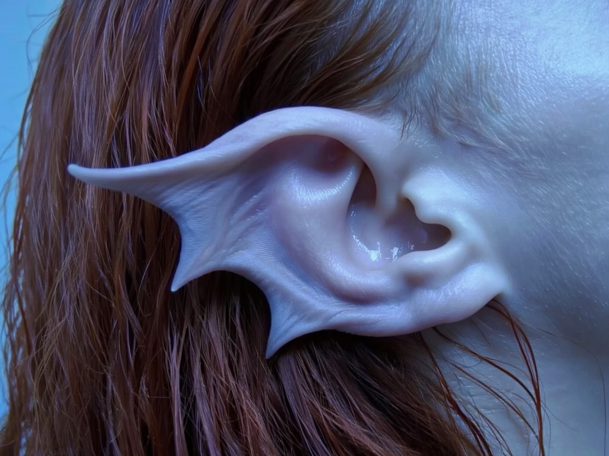 A close-up of a humanoid ear mutated into a soft, fleshy fin structure resembling a bat wing, pale lavender-toned skin with subtle textures and natural folds. The cartilage is extended into curved, ribbed points, creating an organic yet alien silhouette. The ear emerges from long, wet auburn hair, softly catching blueish ambient light. The image is cropped tightly for detail and realism, evoking a post-human aquatic evolution — delicate, eerie, and biologically plausible.