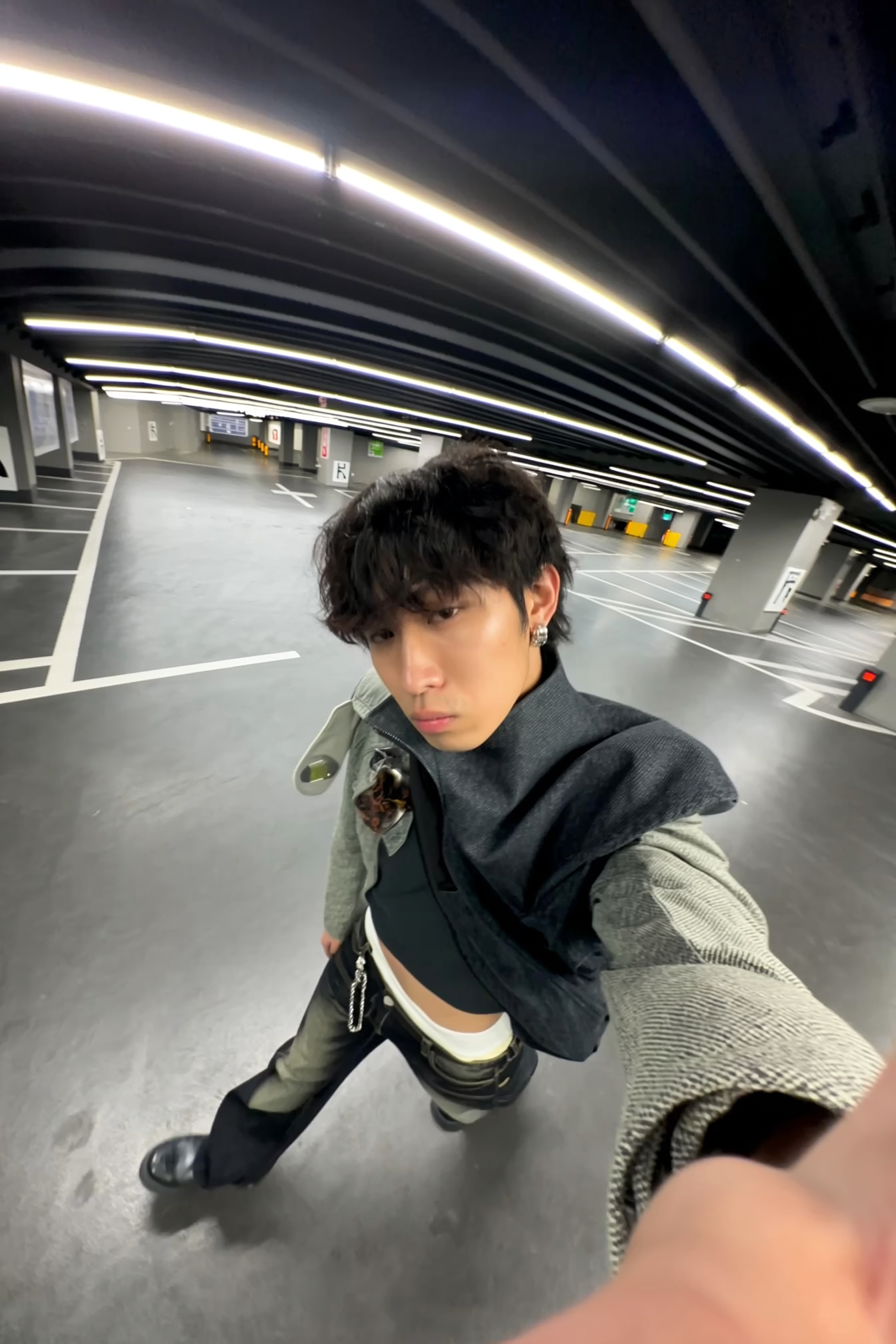 A spontaneous and playful wide-angle selfie captured from a distinctly exaggerated elevated angle typical of iPhone photography portrays a young man casually walking through a realistically detailed, empty underground parking structure. His face is slightly tilted downward with a raised collar, engaging naturally with the camera lens with a neutral, subtly introspective expression. His original outfit draws indirect inspiration from contemporary social-media streetwear aesthetics, featuring a uniquely structured jacket with textured fabric, stylized minimal pants, layered accessories, and a casually tousled hairstyle. Overhead, long linear white light strips on the ceiling create realistic reflections and shadows that enhance the urban atmosphere. Textural authenticity is highlighted through genuine fabric wrinkles, natural hair strands, realistic skin textures, and detailed concrete surfaces of the parking structure. The composition emphasizes pronounced wide-angle distortion, with enlarged facial features and upper body, shot hand-held in a casual selfie pose, capturing the stark yet stylish urban environment. The naturalistic artificial lighting of the space creates believable ambient glows and contrasts, reinforcing the authentic spontaneous vibe of a casual social media selfie.