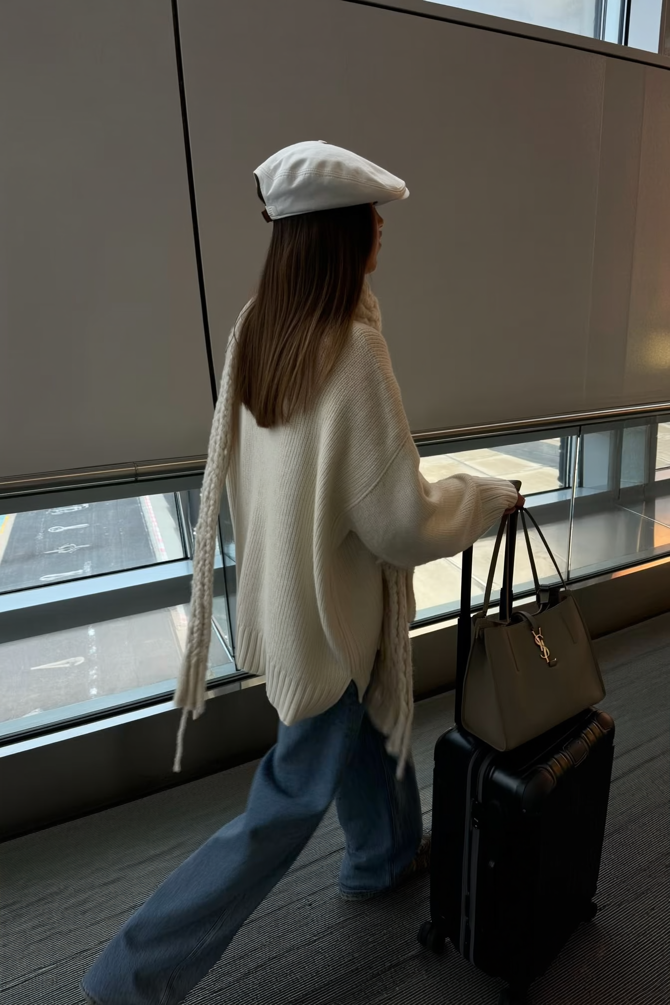 A woman with loose straight hair tucked under a low white cap wears a slightly oversized off-white knit sweater layered with a chunky scarf, paired with relaxed, loose straight jeans. She pulls a matte black spinner suitcase through a modern airport terminal, with a structured Saint Laurent bag securely attached atop the suitcase. Soft, underexposed natural light filters gently through large terminal windows, casting delicate shadows that enhance the tactile knit fabric and the subtle details of her attire and movement.