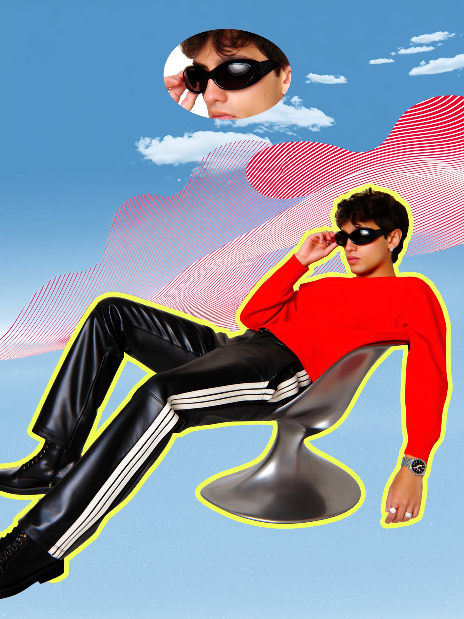 The image features a young man in two distinct poses against a stylized background. In the main pose, he is reclining in a modern, metallic chair with a futuristic design, wearing a bright red sweater, black leather pants with thick white stripes down the sides, and black boots. His body is outlined with a yellow neon effect, adding a graphic pop to the image. The secondary pose is a close-up inset of his face, where he adjusts his black, glossy, oval-shaped sunglasses. He wears rings and a watch, enhancing the fashionable vibe. The background combines a blue sky with white clouds and graphic red and white swirling lines, creating a dynamic, almost surreal atmosphere. The image quality is sharp and vibrant with high definition, the camera angle is varied—an eye-level full-body shot for the main figure and a close-up for the inset, while the overall composition uses graphic art techniques and layering to achieve a contemporary, editorial style.