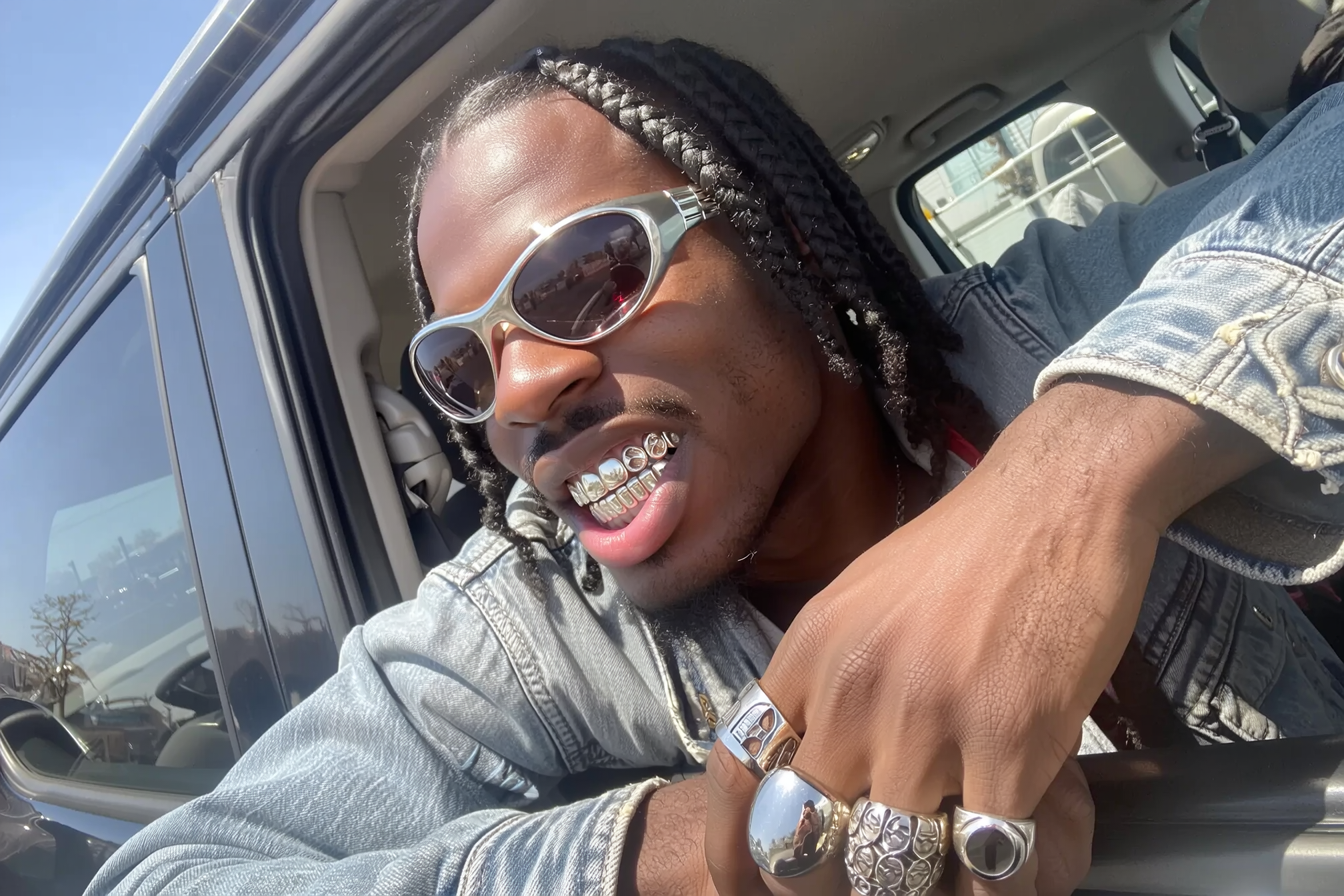 A tight close-up upper-body shot of a 25-year-old Black man with neatly braided hair, on his teeth gleaming a set of refined silver grills that catch ambient sunlight with vivid reflections; the metallic surfaces display subtle engraved patterns and natural highlights that emphasize their intricate design and polished, realistic texture. He wears a well-worn denim jacket featuring textured visible stitching, accented by large reflective rings stacked across all fingers, and sporty wraparound sunglasses resting casually. Shot from the side through a car’s passenger window, soft reflections and a slight analog softness add cinematic warmth to the harsh but natural sunlight casting lifelike shadows. The faint interior of the car is visible in the blurred background with soft highlights on metal and glass, all framed with a spontaneous, casual iPhone photographic intimacy and a gently tilted composition emphasizing candidness.