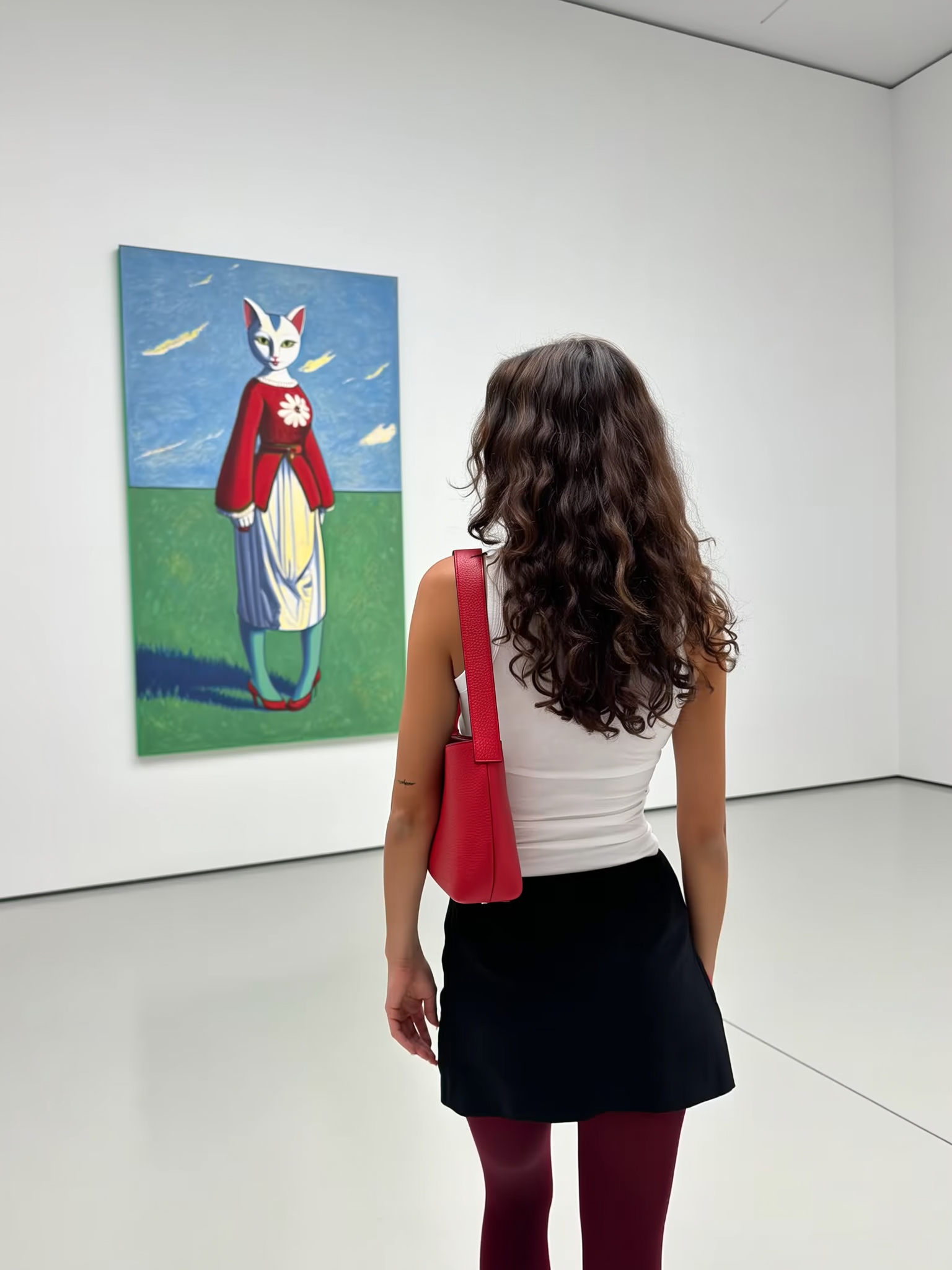 High-resolution iPhone photograph tightly composed to capture a stylish young woman standing alone at medium distance from a pristine white gallery wall adorned with a large modern painting depicting a cat-suited character in vivid colors. She is seen from behind at eye level, her posture relaxed and natural, arms resting gently by her sides. Her rich, curly brown hair cascades softly over her shoulders, catching the soft, diffuse gallery light that sculpts gentle shadows and highlights. She wears a sleek, fitted white tank top paired with a short black skirt that crisply contrasts with rich burgundy tights, lending depth and texture to her ensemble. A vibrant red shoulder bag casually hangs from one shoulder, its leather grain subtly catching the even light. The minimalist gallery space with clean white walls provides a calm, graphic backdrop, creating a clean horizontal rhythm in the composition. The overall aesthetic evokes a candid, fashion-forward moment of thoughtful engagement within a modern art setting, emphasizing textural realism and editorial sophistication.