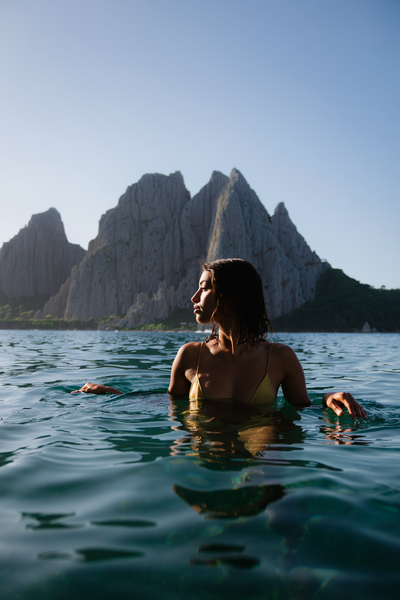 7. A serene shot of a woman waist-deep in the sea, her hands gently skimming the water’s surface, dramatic cliffs behind her.
