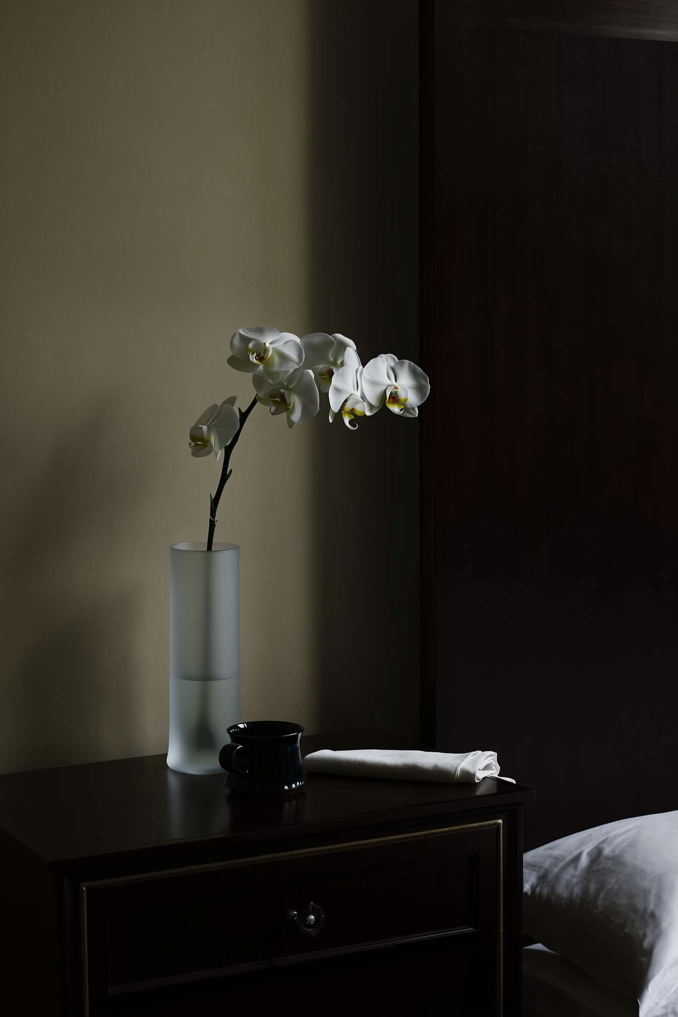 A single white orchid stem in a tall frosted glass vase placed on a dark wooden nightstand. The scene is sparse, with only a black ceramic cup and a linen napkin folded beside it. The lighting is moody and dramatic — a chiaroscuro contrast between soft light and dark shadows.