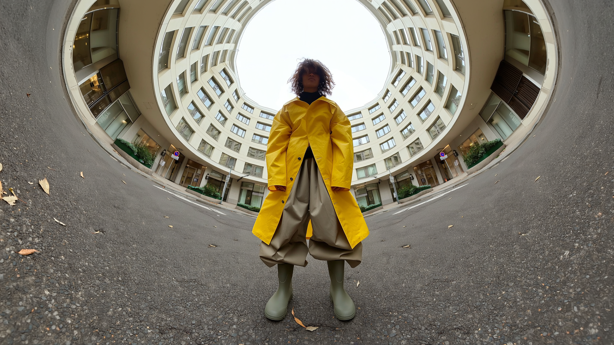 A spontaneous stylish 360-degree candid image captured from ground level in the middle of a quiet urban roundabout under a softly curved dome of surrounding buildings. A solitary figure stands naturally center frame, wearing an effortlessly chic sculptural yellow raincoat crafted from glossy, textured waterproof fabric, paired with massive, wide-flared pants in a complementary neutral tone with subtle drapery and soft folds. The figure's posture is relaxed yet confident, arms hanging loosely, head slightly tilted, hair tousled naturally with nuanced texture and light imperfection. The footwear consists of matte-finish rubber boots with gentle scuff marks typical of everyday wear. The ambient lighting is a diffused overcast daylight casting soft, even illumination, gently accentuating the smooth architectural surfaces of the curving buildings forming a seamless circular dome overhead. The ground is a finely textured asphalt surface with subtle cracks and scattered leaves, adding to authentic urban tactile realism. The spherical, circular upward-facing composition from the central floor-level viewpoint creates an immersive tunnel-like effect, enveloping the viewer within the dome and distorting perspectives with elegant visual curvature characteristic of spontaneous 360-degree photography captured by a portable camera connected to an iPhone, emphasizing the figure's stylish presence with natural candid spontaneity and detailed fabric and environmental textures.