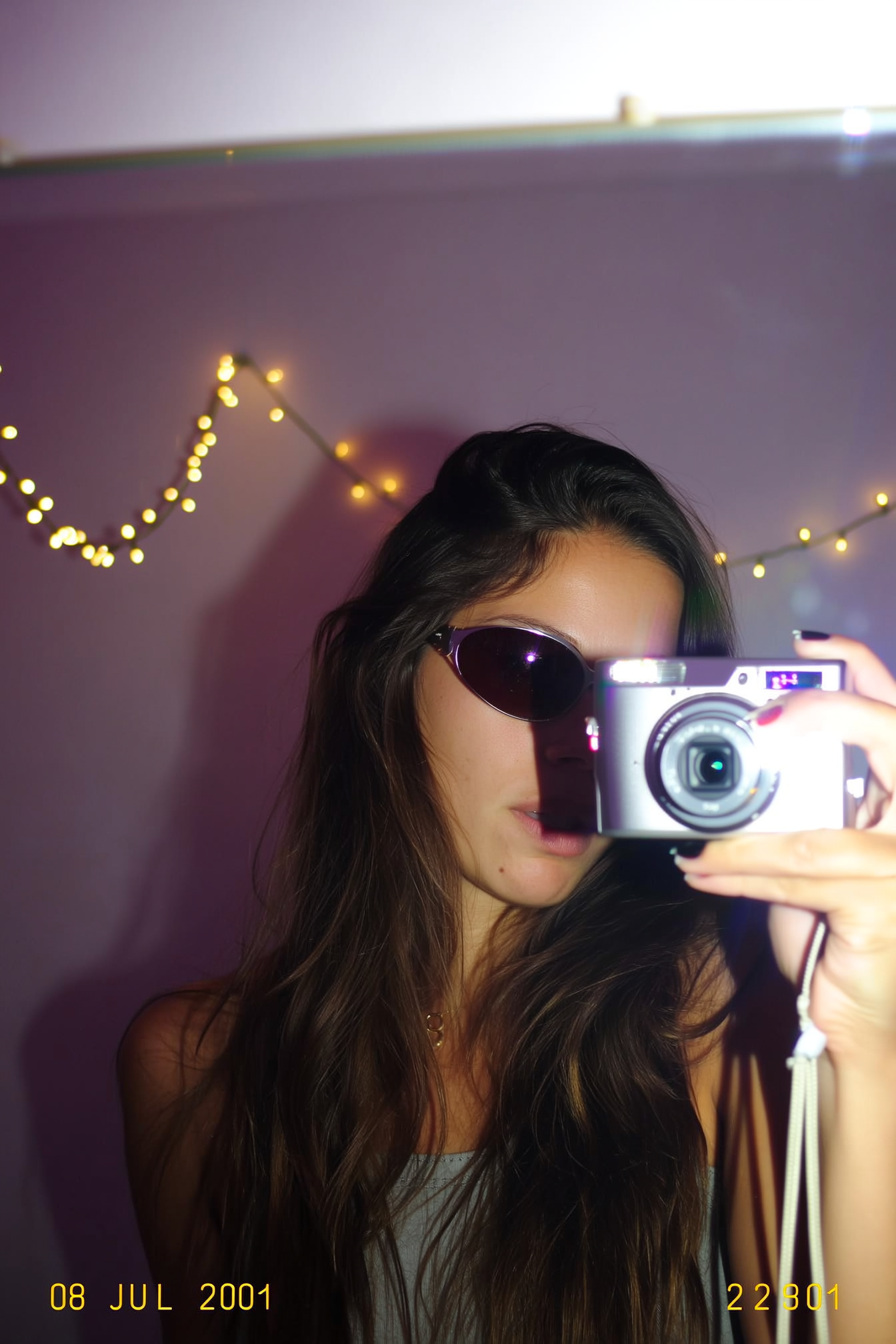 A quick pop from the built-in flash throws harsh shadows across her face, sunglasses reflecting crooked summer string lights glowing faintly behind her. Pixel fringing blurs the worn edges of the mirror she snaps into, and the silver digital camera peeks from her hand with a subtle flash bloom. CCD speckles dance in the pastel dimness, while the tungsten room light tugs warm highlights across the cool shadowed corners. The angle is slightly off-kilter, the soft focus edges stuttering as if the moment was caught mid-shake, timestamped “08 JUL 2001 22:45” in the bottom corner. The photo quality is low-resolution and somewhat grainy.—early-2000s digicam snapshot, grainy low-res quality