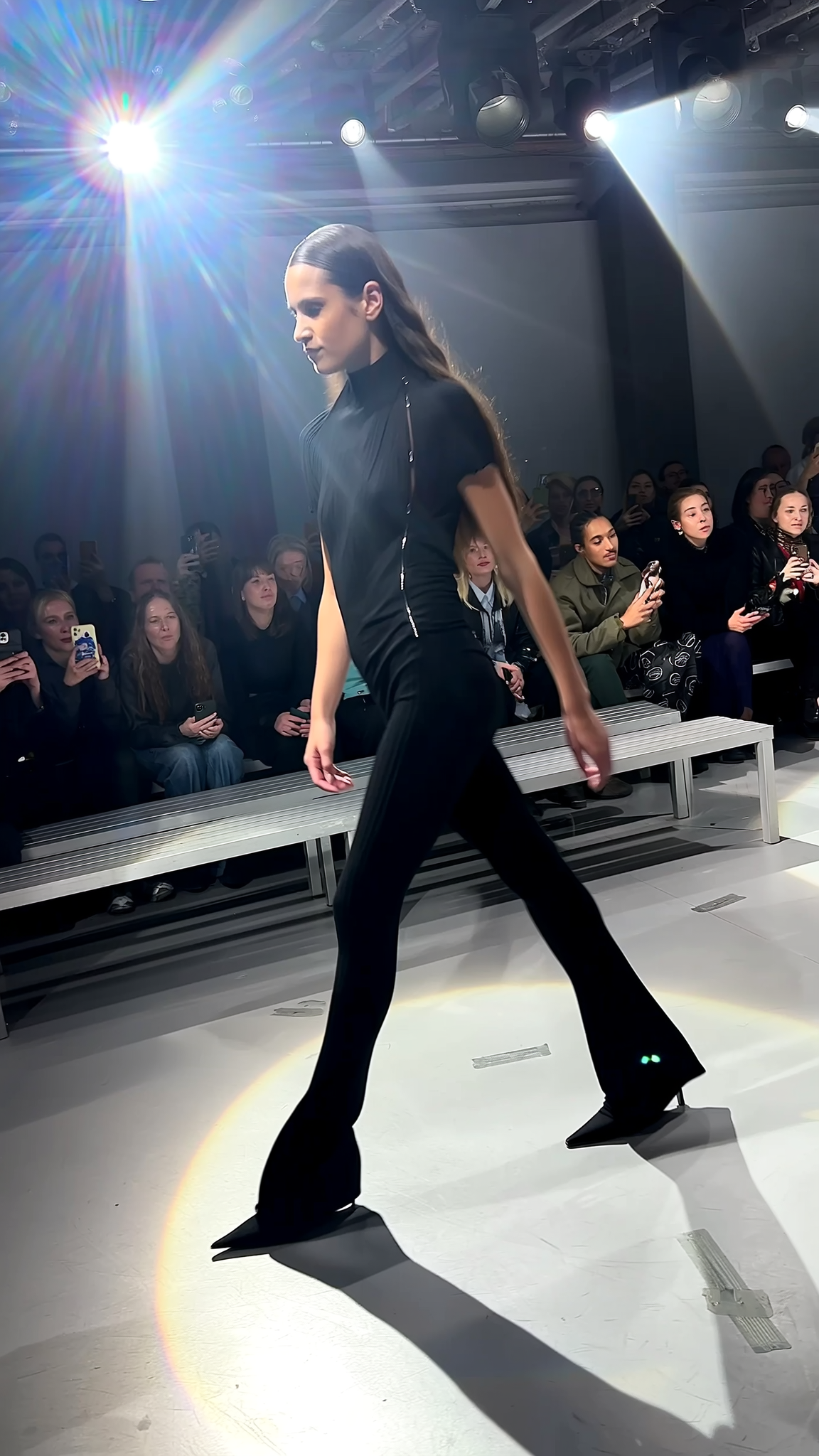 A confident model cuts a sleek silhouette in a form-fitting futuristic black ensemble, the fabric matte yet edged with subtle gloss that catches the razor-bright spotlights overhead. Her stride stretches across a gleaming white runway flanked by minimalist silver benches where an eager crowd leans forward, faces illuminated by discreet phone screens and the sparse luminescence from cool, industrial LED fixtures above. The intense beams carve sharp shadows beneath her elongated legs, emphasising the precision tailoring and streamlined contours of the outfit. The runway surface shows faint scuff marks and taped sight-lines underfoot, grounding the hyper-modern aesthetic in real-world grit. Slight motion blur ghosts along the pointed toe boots and the angular hemline as the handheld iPhone shot tilts diagonally from a front-row perspective, capturing the tactile texture of the stretch fabric and the model’s focused expression framed by crisp stage lighting. Sensor noise gently textures the shadow areas, contrasted by mild bloom halos that envelop each spotlight, creating a vivid, live-show immediacy. —contemporary runway snapshot, shot on iPhone