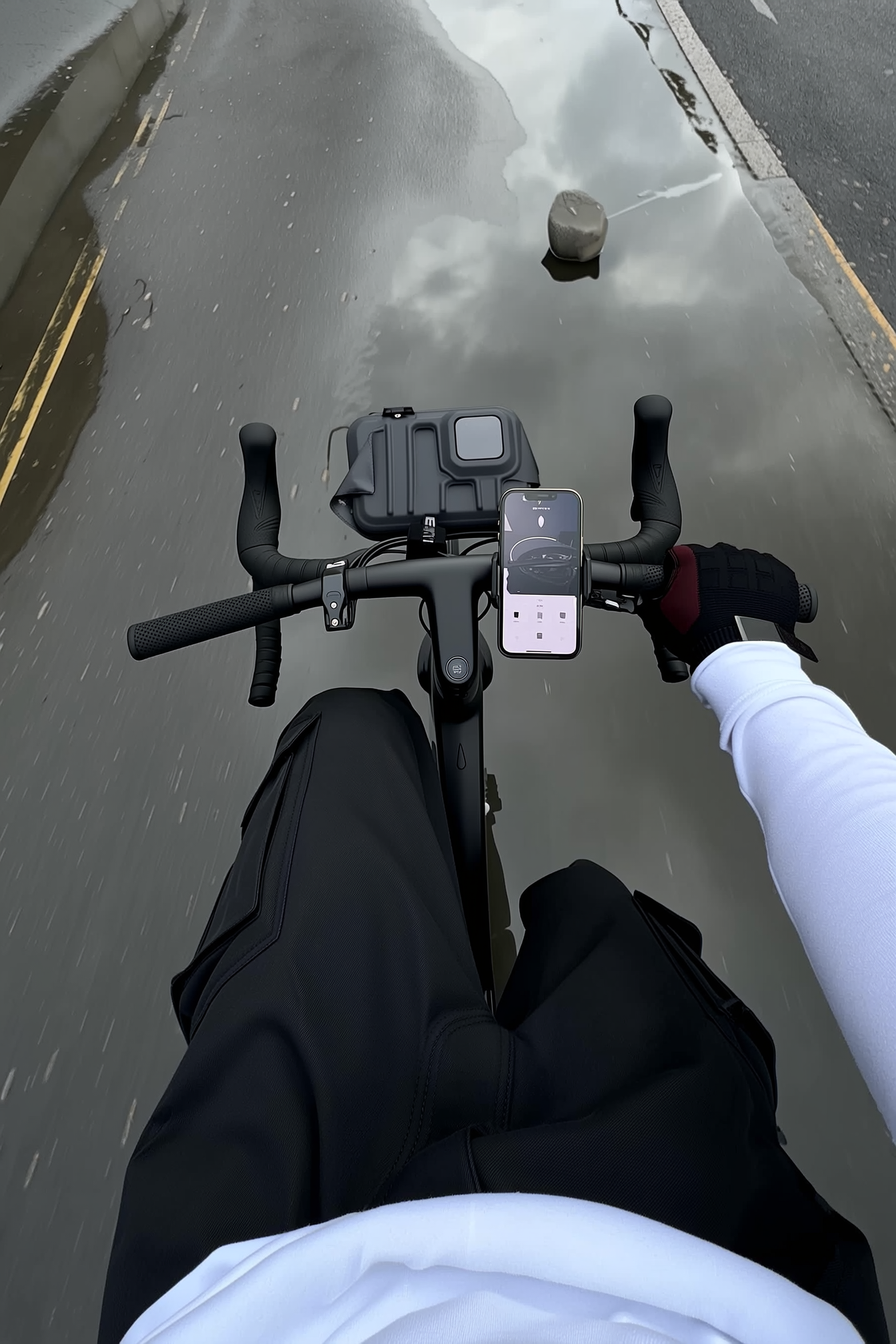 From the viewpoint of a handheld iPhone, a man clad in sleek black cargo pants and a crisp white long-sleeve tee pedals a state-of-the-art e-bike, his gloved hands firmly gripping the handlebars. Positioned in the front rack, a compact drone case adds a hint of modern tech utility. Below, the wet concrete streets shimmer with puddles reflecting the soft, diffused light of a gray, overcast sky, lending a quiet, reflective mood to the scene. The composition balances tactile details—the fabric's weave, the matte grip of gloves, and the damp pavement's slick surface—with natural, muted tones and soft shadows to evoke a sense of cool, urban calm.