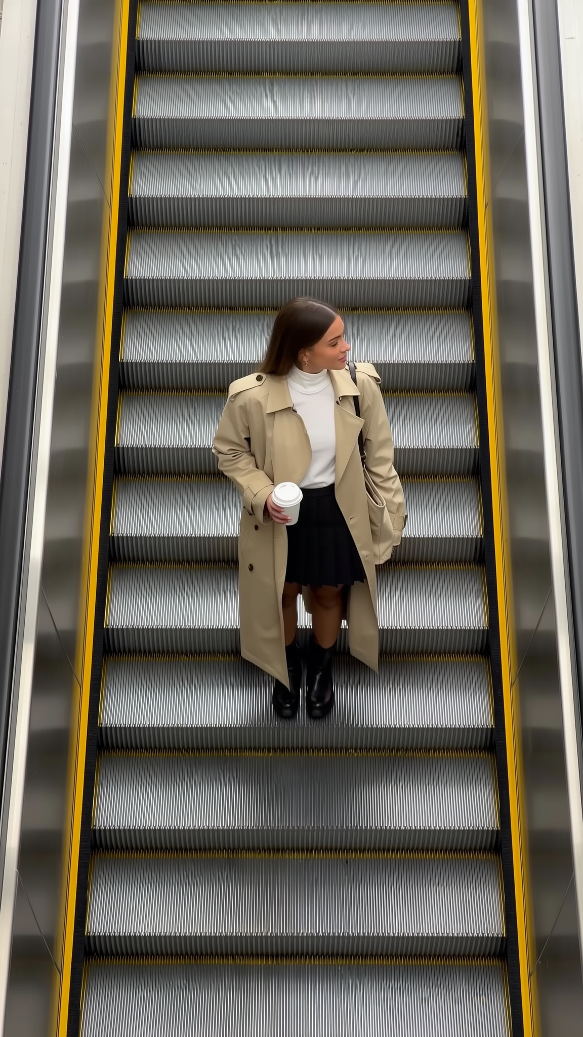 The woman wears a modern beige trench coat layered over a pleated black skirt and a crisp white turtleneck, embodying a minimalistic yet chic aesthetic. She casually holds a cup of coffee in one hand and carries a canvas crossbody bag, adding subtle texture and interest to the look. Her gaze is directed softly to the side, her posture relaxed yet confident. Soft, ambient indoor lighting gently enhances the tactile details of fabrics and skin tones, lending an editorial feel that captures the spontaneous and fashion-forward spirit of an escalator fit check photograph.