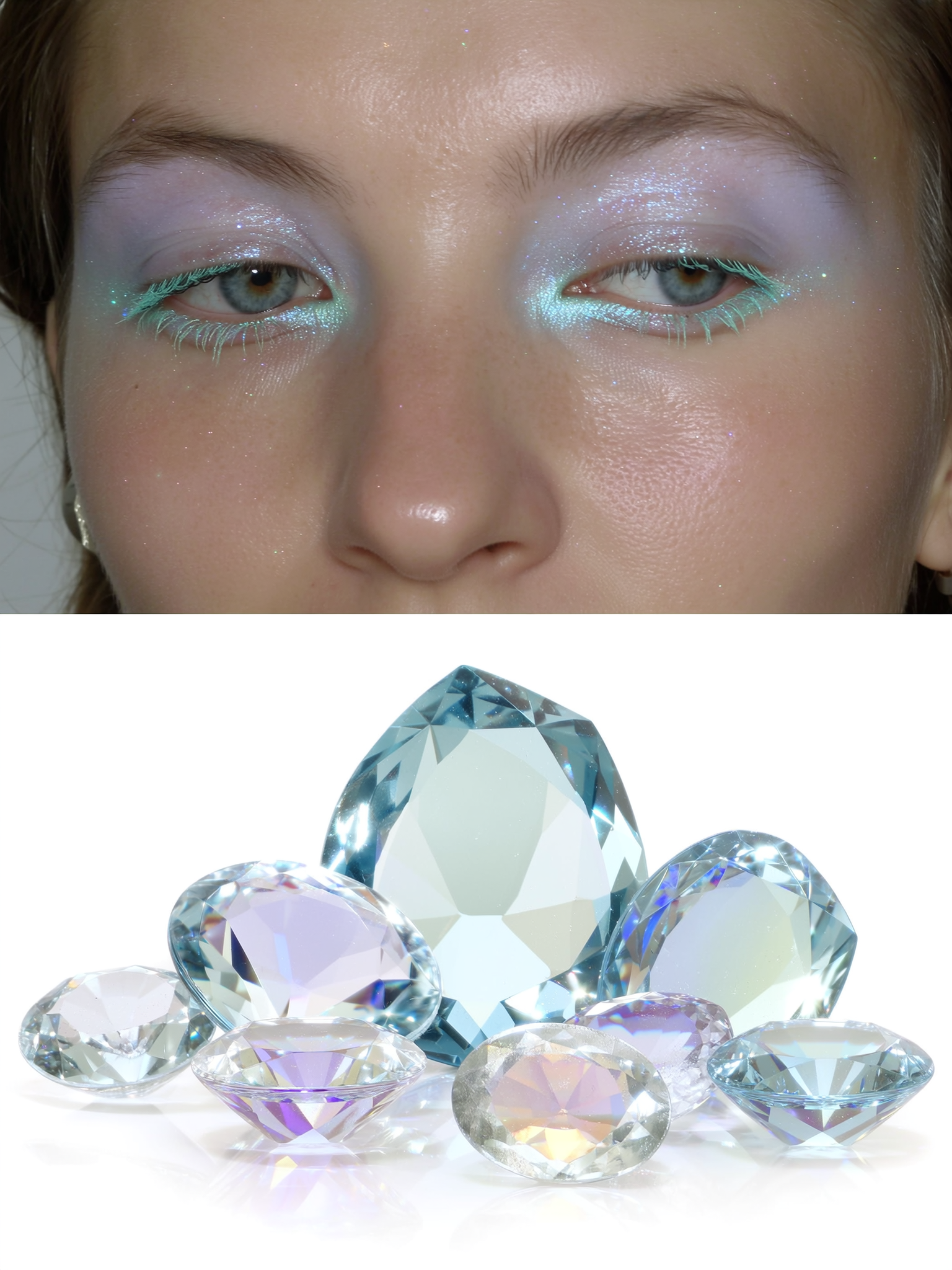 The bottom half displays a cluster of pastel-hued diamonds and sparkling gemstones on a clean white background. The gems feature gentle tints of icy blue, pale lavender, and soft silver with subtle iridescent reflections and finely detailed facets that catch light realistically. The stones rest naturally on the surface with soft, feathered shadows anchoring them lightly. The gemstones’ multifaceted textures with slight imperfections and small inclusions are clearly visible, enhancing realism. The composition is centered, harmonizing the cool, ethereal palette and crystalline textures with the eye makeup above. The horizontal split is perfectly centered, linking the delicate light reflections and pastel tones into a seamless, editorial, surreal portrait of brilliance and softness.