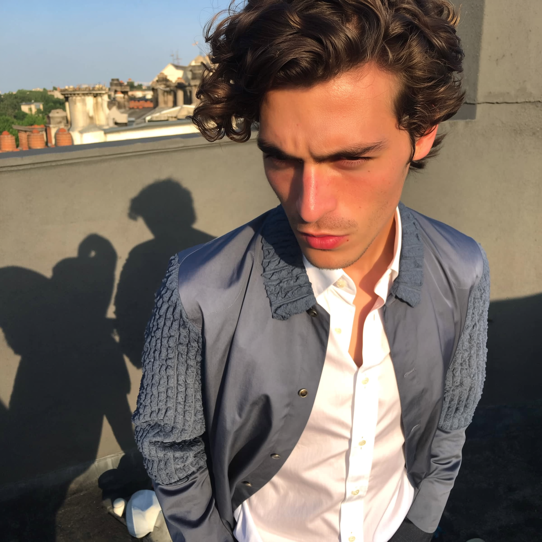 A spontaneous candid photo of a male model with sun-kissed skin and a focused, intense gaze standing casually on a rooftop with bold geometric shadows falling around him. He wears a slate-gray jacket featuring distinct textured sleeves paired with a crisp white shirt buttoned up to the collar, showcasing realistic fabric grains and subtle wrinkles. The late afternoon natural light creates soft highlights and shadows on his skin and clothing, enhancing authentic texture and natural skin details. The framing is slightly tilted and off-center, capturing a genuine, relaxed posture typical of iPhone photography. The overall mood conveys raw, effortless style with natural urban architectural elements in the background, emphasizing an authentic and intimate atmosphere.