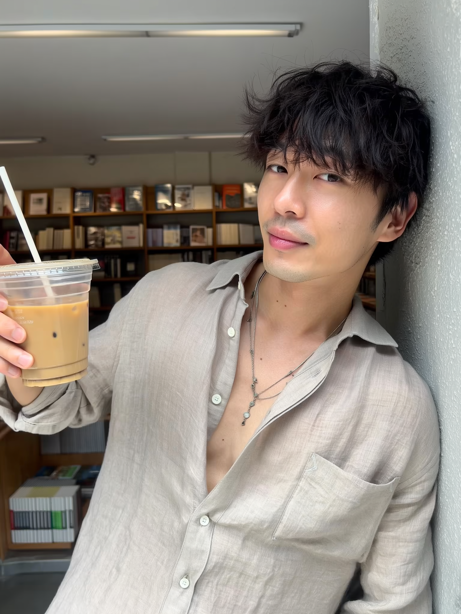 A spontaneous, candid iPhone photograph of a pretty East Asian man leaning casually against a textured bookstore wall, snapping a relaxed selfie while holding a clear plastic cup of iced coffee. He wears a minimal, slightly unbuttoned beige linen shirt with layered delicate silver chains catching soft natural daylight, revealing fine fabric textures and subtle skin details. His tousled dark hair frames a calm, magnetic gaze directed at the camera, embodying casual authenticity. The bookstore background is softly out of focus with muted neutral tones, emphasizing the subject's serene presence. The composition is casually imperfect with a slight tilt, enhancing genuine intimacy and relaxed coolness typical of natural iPhone photography.