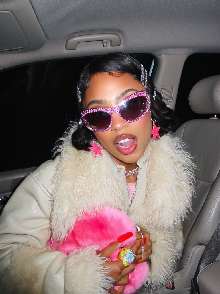 She leans confidently in the front seat of an old car, rocking that cream shearling jacket with shaggy faux fur that glimmers under the harsh iPhone flash, its glossy curls catching every bit of attention. Her oversized pink wraparound sunglasses sparkle sharply, with silver accents sending little starbursts of city light around her face, while chunky glossy pink clips line her sleek dark hair, adding a playful bounce. Bold star-shaped earrings and a chunky pastel ring flash brightly alongside her crisp red nails gripping a rhinestone-studded hot pink fuzz purse close. The photo has a grainy, low-resolution quality, suggesting it may be a still from a video or taken with an older digital camera. The framing is casually off-center and cropped tight, whipping up that effortless Y2K coquette feel—the perfect snapshot of glossy girly chaos, all sparkle and texture-heavy flair.—colorful glam early-2000s snapshot, grainy low-res nostalgia