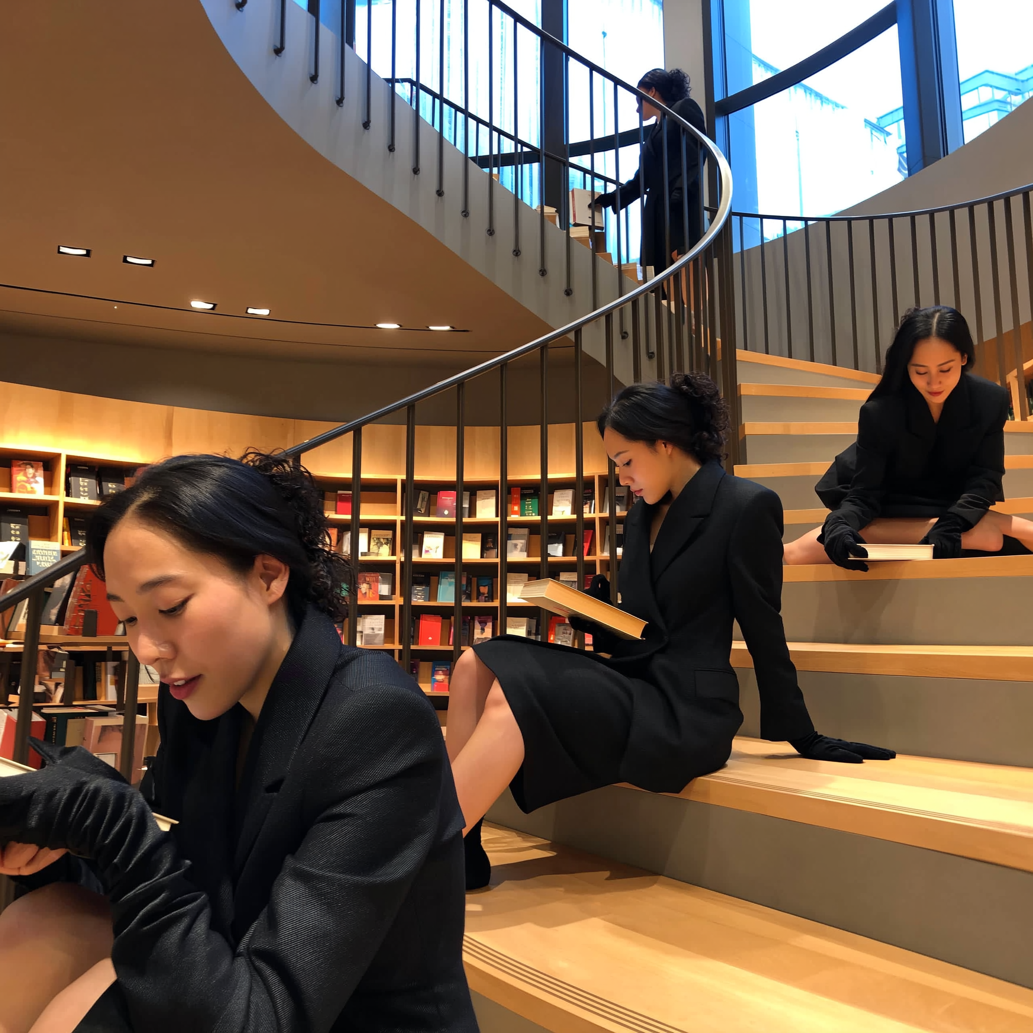 An imaginative and visually rhythmic iPhone snapshot of a woman duplicated several times throughout a modern bookstore with tiered wooden shelves and winding spiral staircases. She wears a sharp, structured black blazer-dress hybrid and matching long black gloves, her expressions ranging from contemplative while seated on minimalist wooden steps, to engaged while perched halfway up a sleek ladder reaching for books, and calm as she gently closes a hardcover tome. Natural daylight filters softly through large windows, casting authentic shadows that reveal delicate skin texture, subtle fabric weave of the blazer-dress, and the gentle sheen of the gloves. The composition juxtaposes close-up figures with distant ones, overlapping naturally yet surrealistically, capturing a spontaneous, casual candidness reflective of iPhone photography. The framing intuitively crops a few figures off-center and utilizes slightly unexpected angles to enhance the visual rhythm, making the repeated woman appear as a flowing narrative of quiet moments within the bookstore's serene atmosphere.