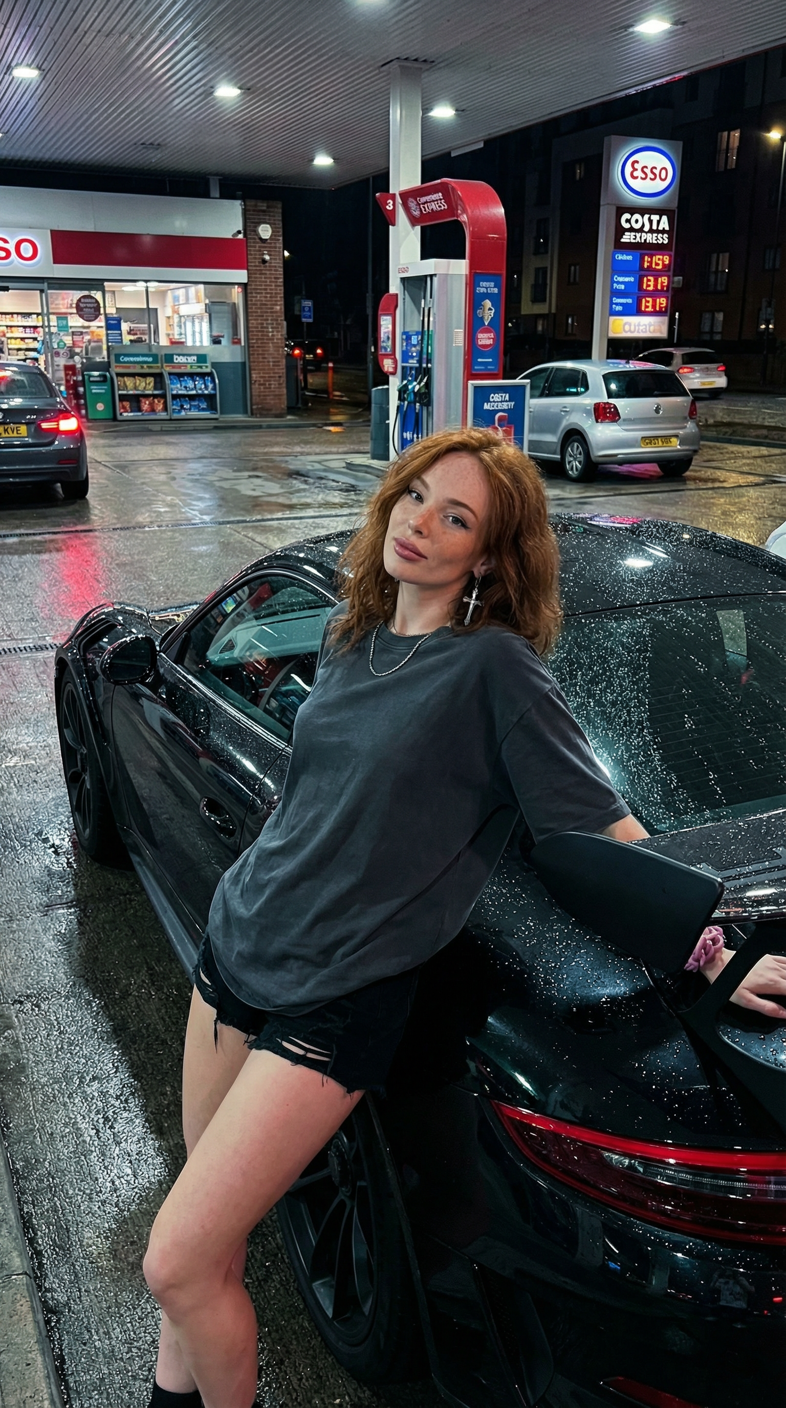 Face accuracy 100%. The scene captures the ambiance of a gas station in england at night, with the ground appearing wet and reflecting the colorful urban lights and signs The background includes typical gas station elements and a building with signs. The image should have ultra-realistic and detailed cinematic quality, as if captured by an iPhone 17 Pro Max, with natural proportions and realistic textures.
