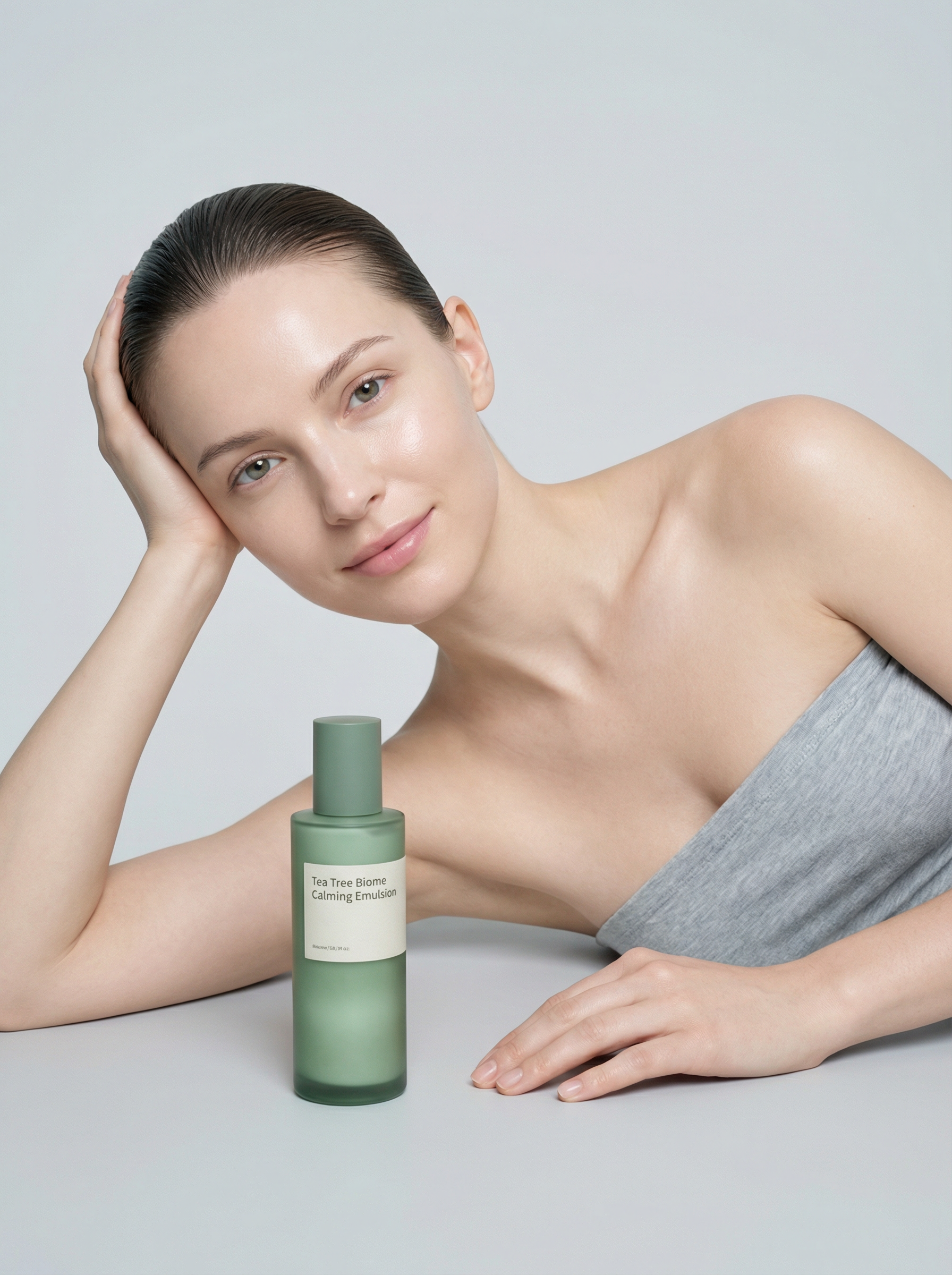 Texture emphasis: smooth natural skin, matte bottle finish, soft highlights.